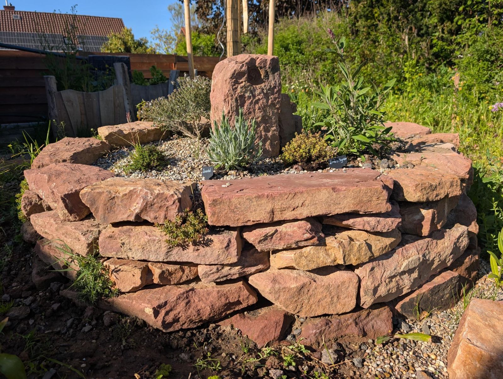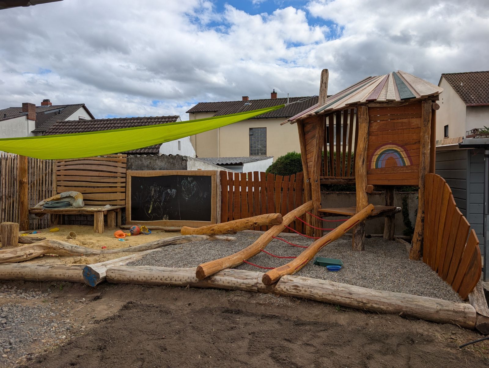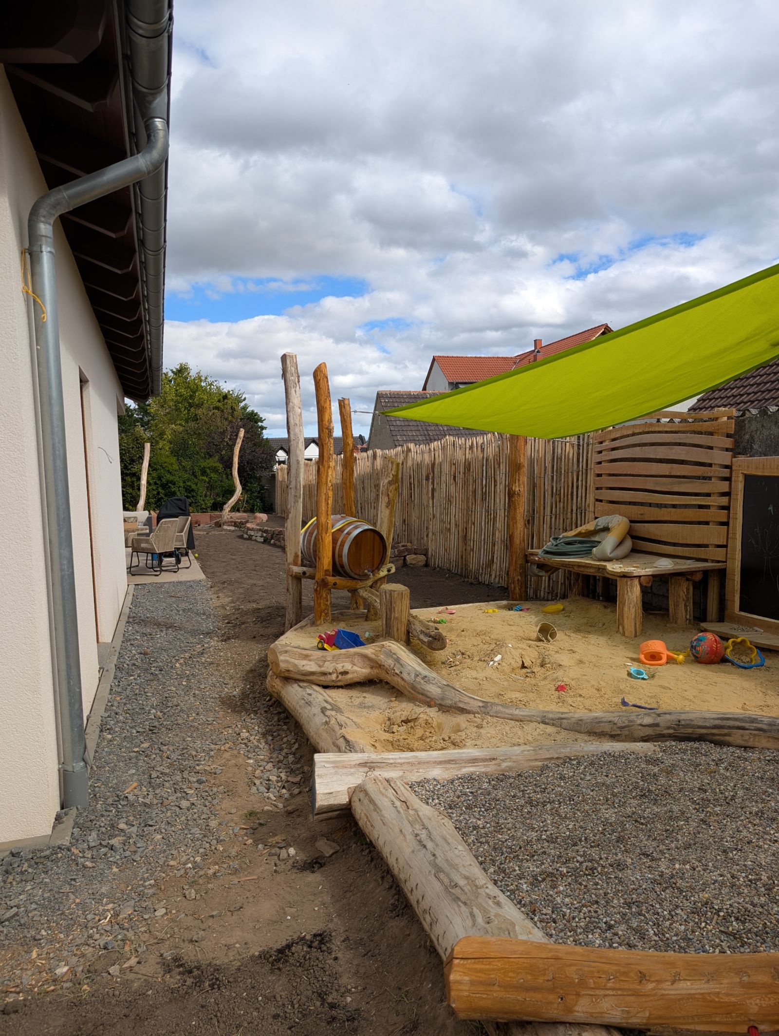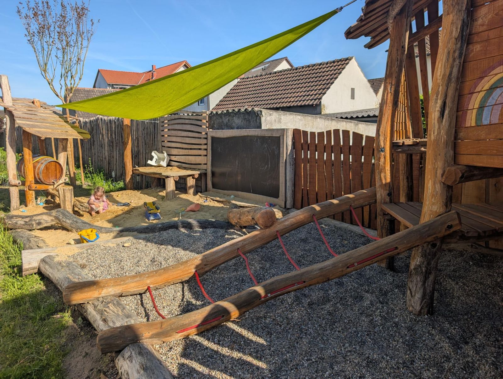 Ein abwechslungsreicher Garten mit Spielbereich, Matschplatz und naturnahen Pflanzungen. Elemente wie Kräuterspirale, Hochbeete, Wildstrauchhecke und Klimarasen verbinden Gestaltung mit ökologischer Funktion.