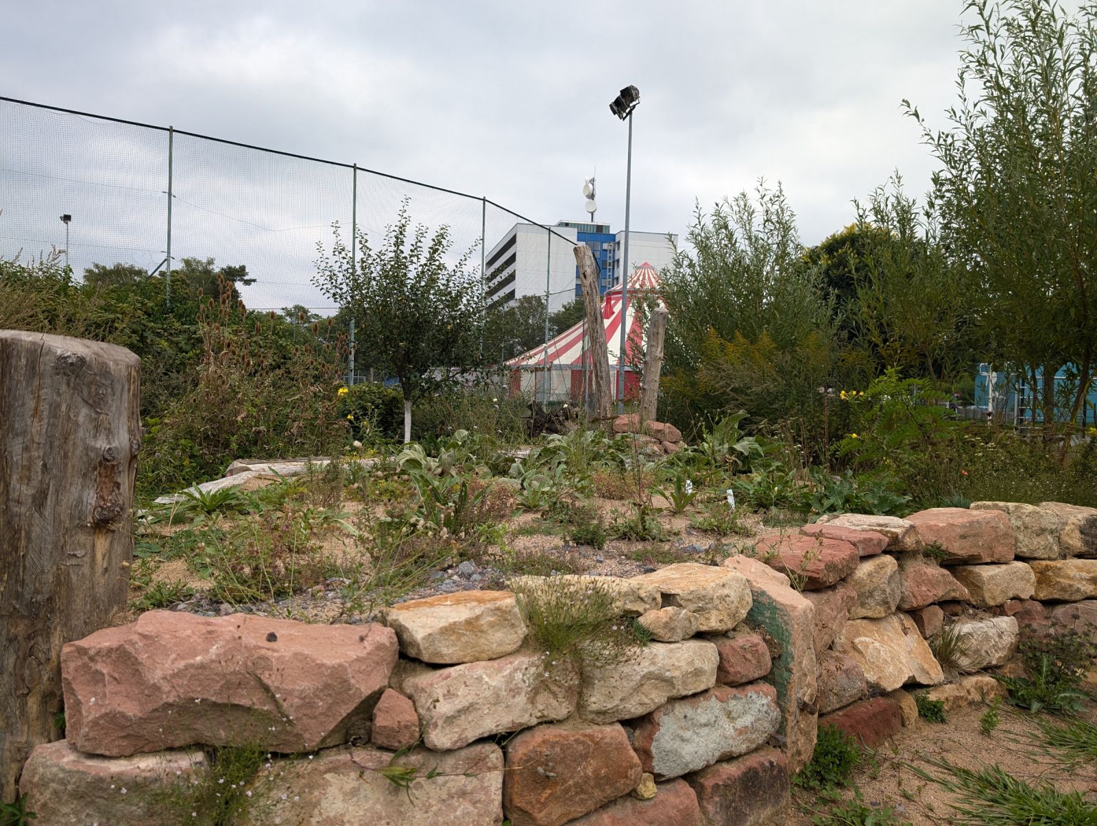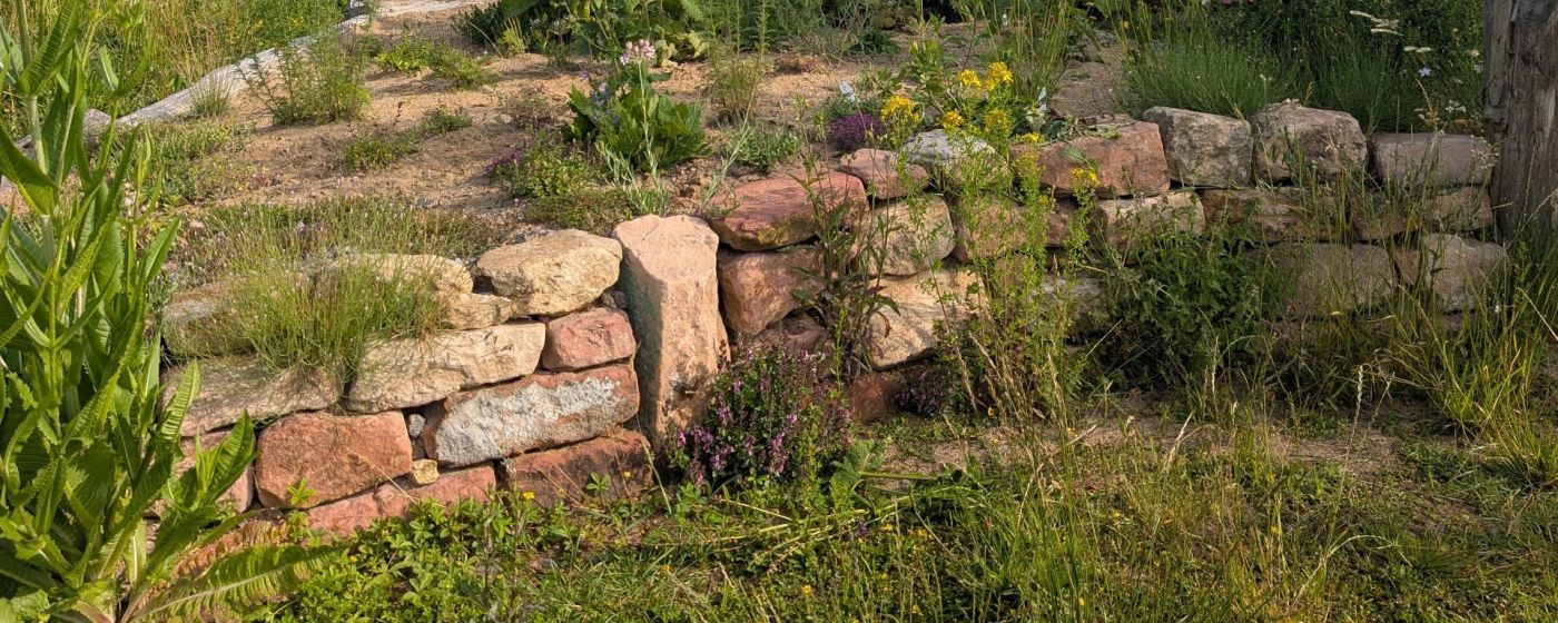 Ein Naturgarten, der durch gezielte Gestaltungselemente weiterentwickelt wurde: Eidechsenburg, Trockenmauern, Magerbeete und ein Sumpfbereich schaffen vielfältige Habitate. Eine Pergola aus Robinienholz bietet Schatten und Aufenthaltsqualität.