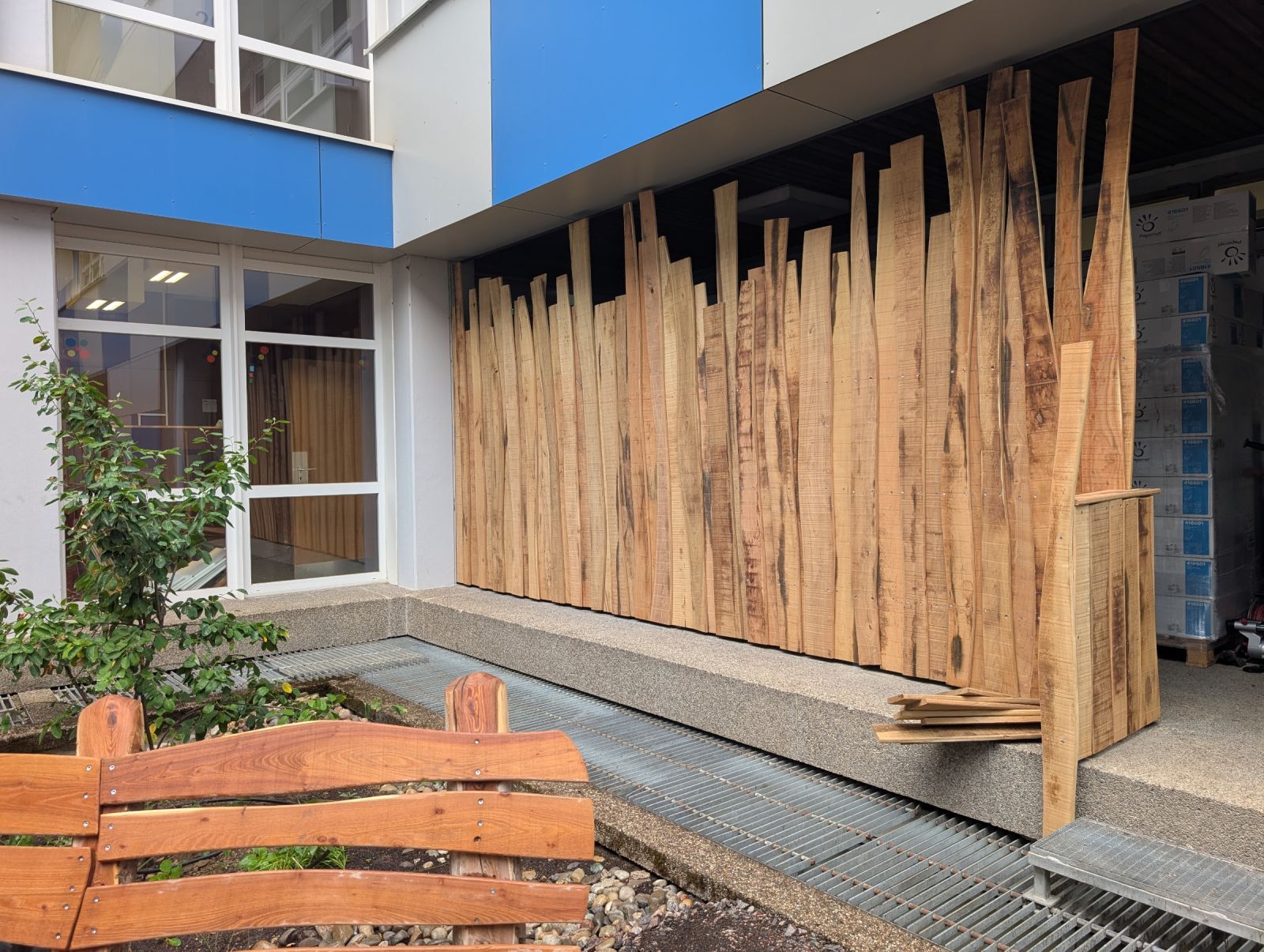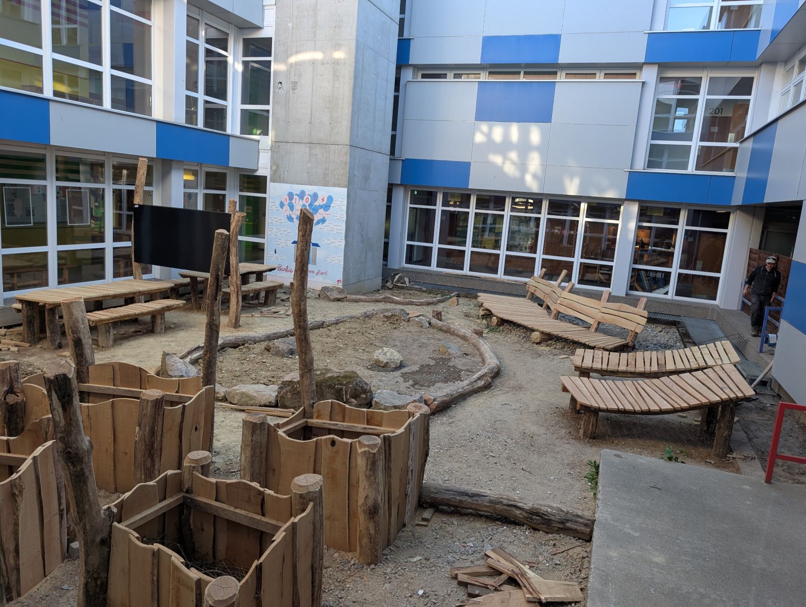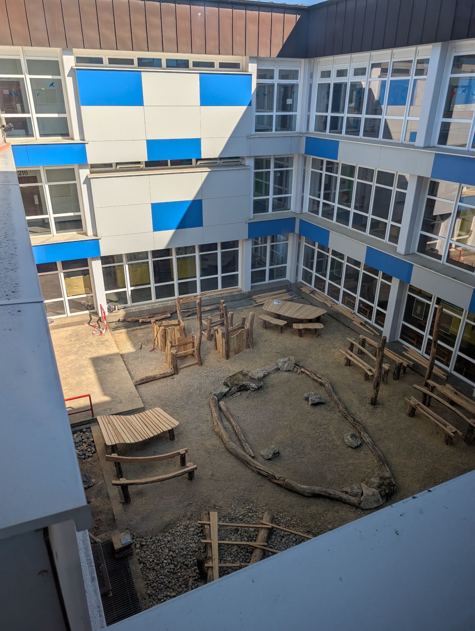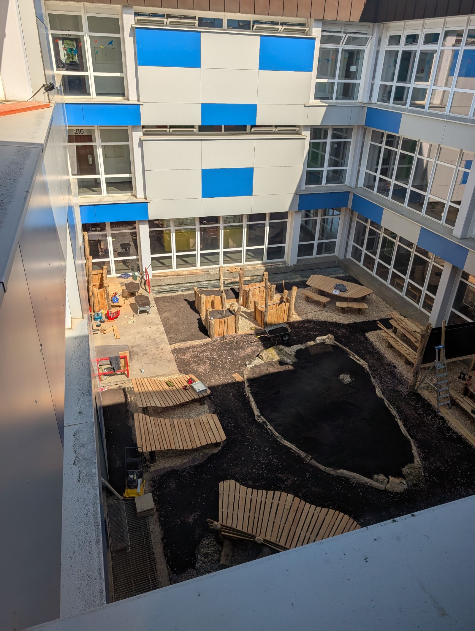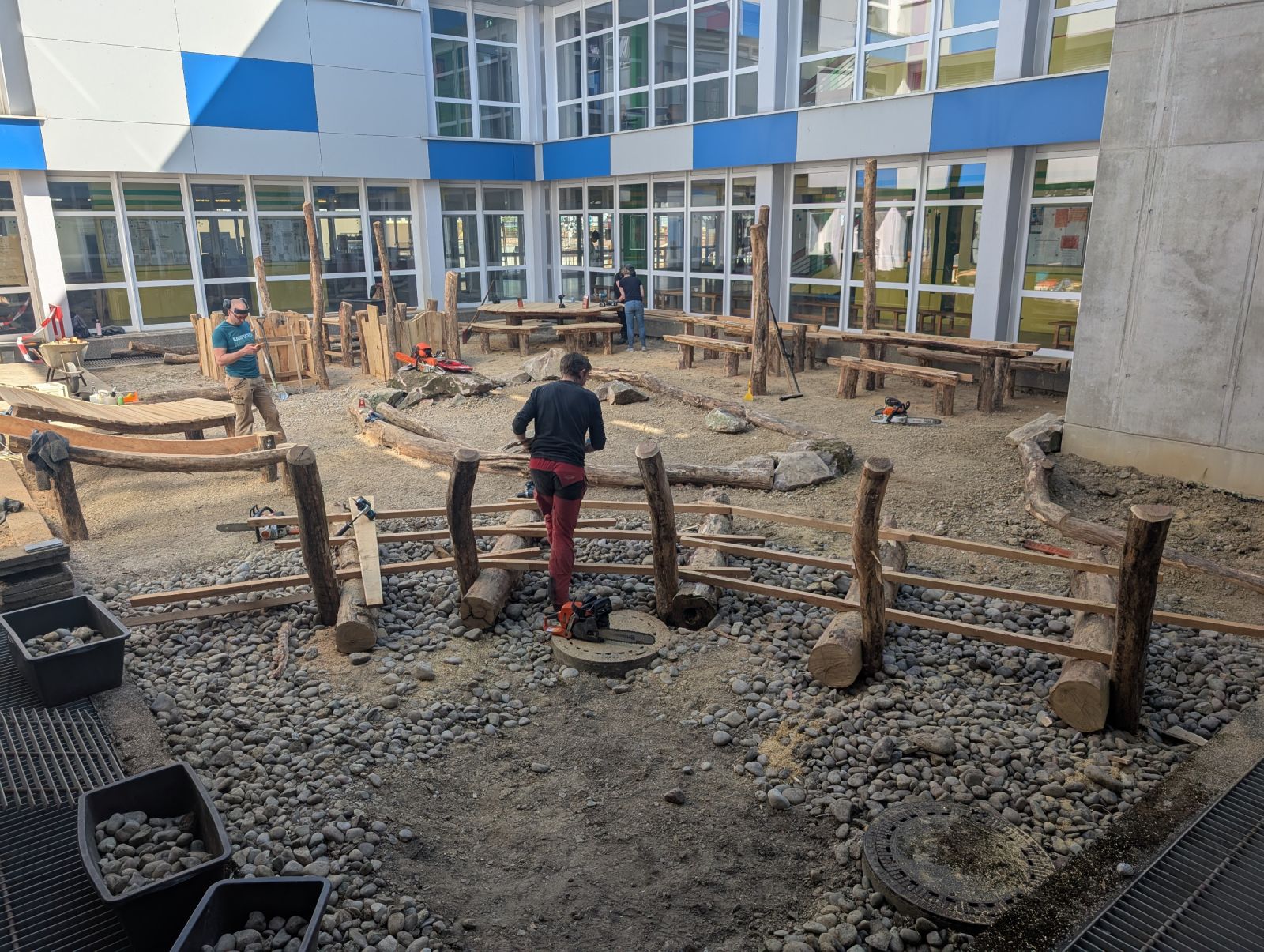 Ein in die Jahre gekommenes Atrium wurde zu einem attraktiven Aufenthalts- und Lernort umgestaltet. Sitzbereiche, ein zentraler Baum, Hochbeete und vielfältige Grünstrukturen schaffen eine einladende Atmosphäre unter dem Leitgedanken „Pausenhof goes green“.